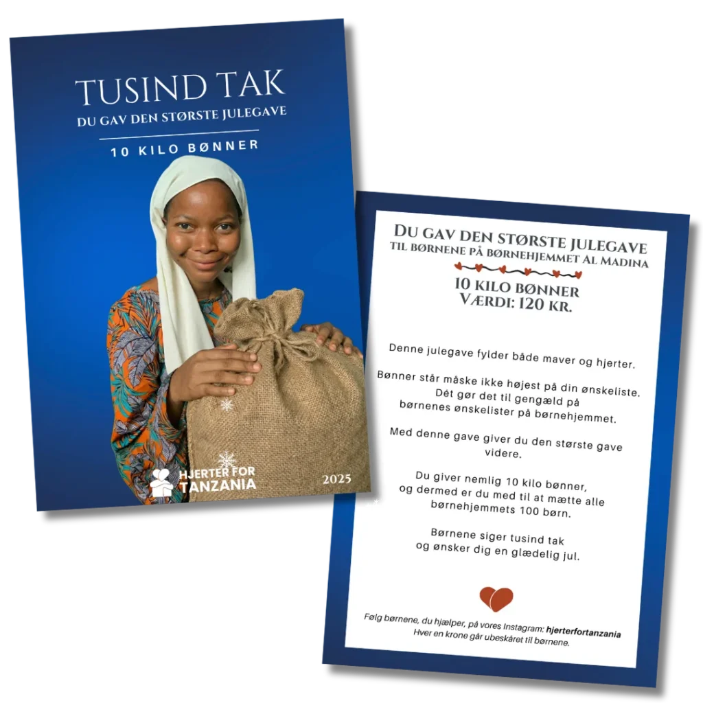 Med denne gave giver du den største gave videre. Du giver nemlig 10 kilo bønner, og dermed er du med til at mætte alle børnehjemmets 100 børn.