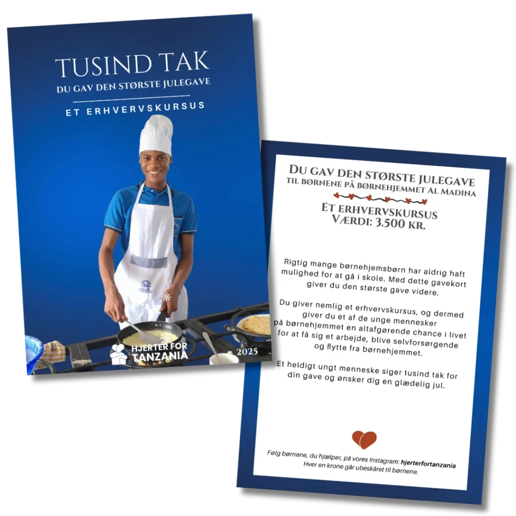 Når du køber et gavekort, giver du den største gave videre til børnene på børnehjemmet. Du kan vælge mellem 11 forskellige gaver, som alle er med til at skabe håb og muligheder for børnene.