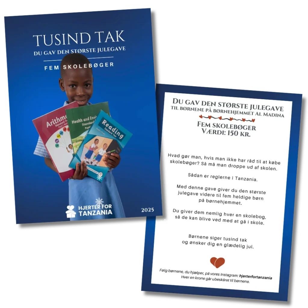 Med denne gave giver du den største julegave videre til fem heldige børn på børnehjemmet. Du giver dem nemlig hver en skolebog, så de kan blive ved med at gå i skole.